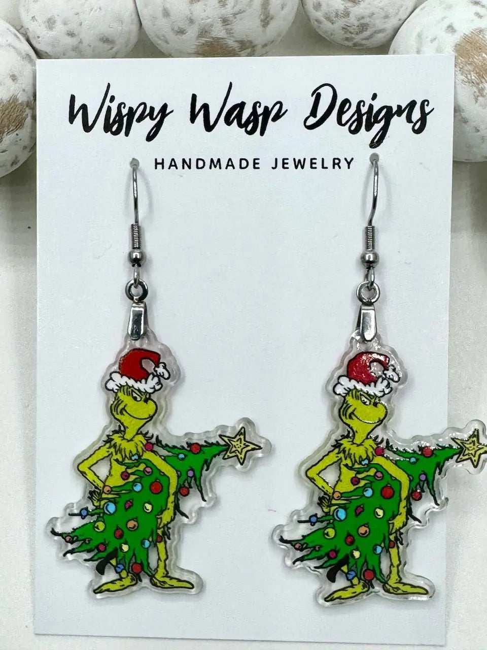 Mean Green Christmas earrings are whimsical and handcrafted for holiday outfits. Each earring features a Grinch character that adds playful charm to festive looks. The hypoallergenic and tarnish-resistant materials make these earrings ideal for all-day wear.