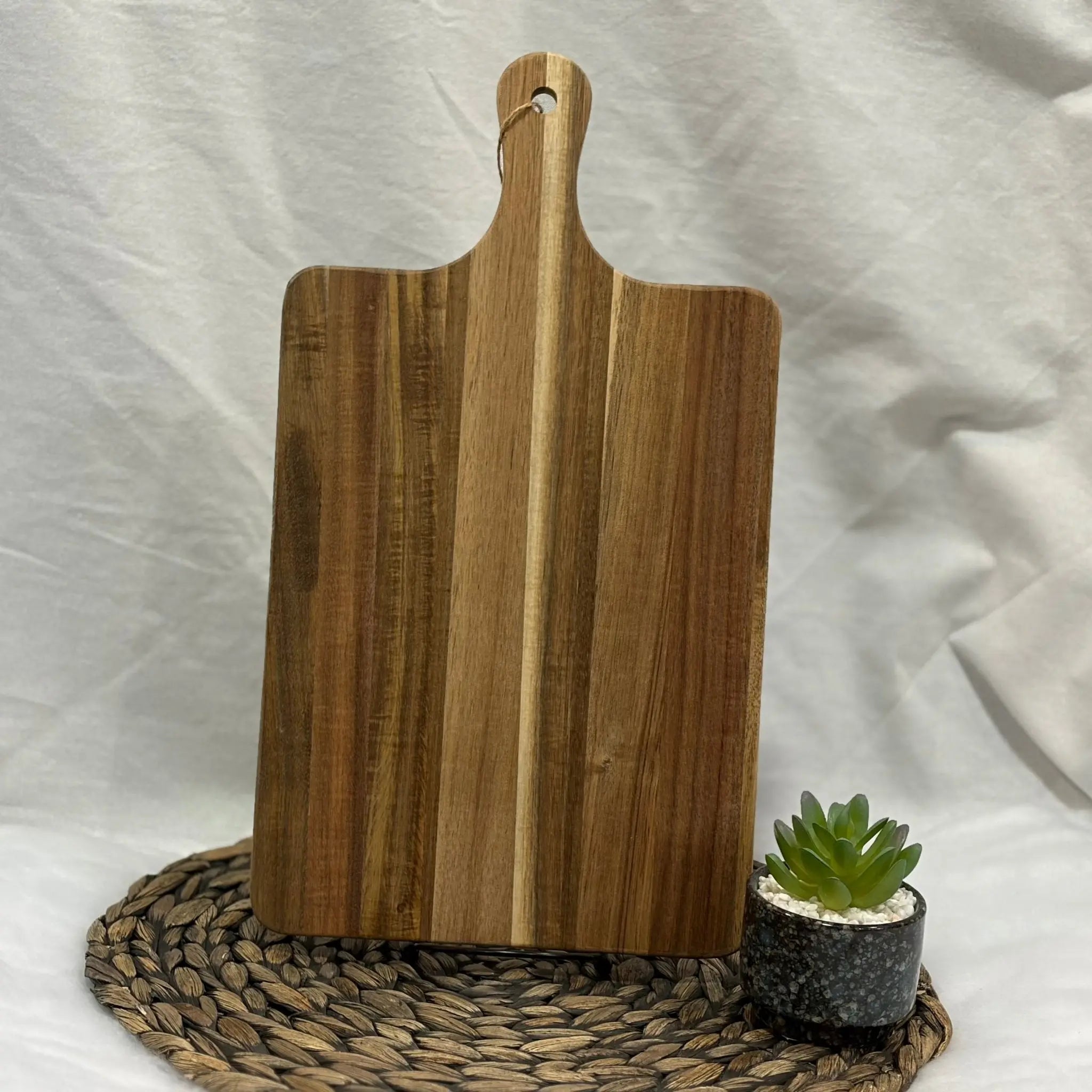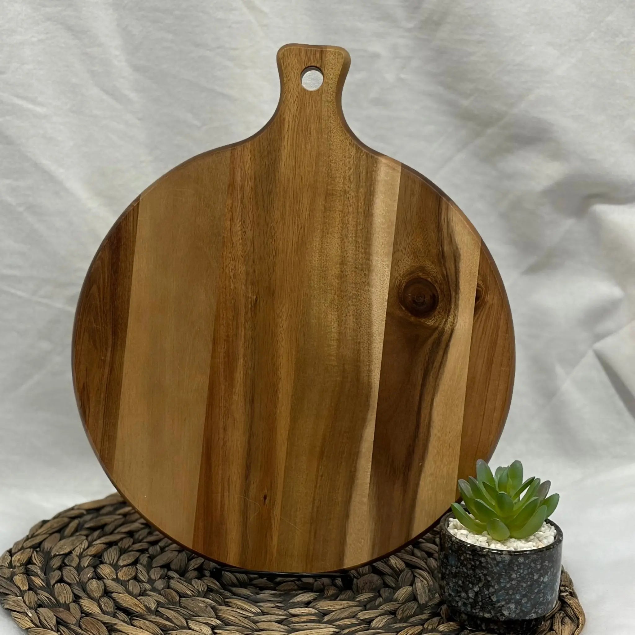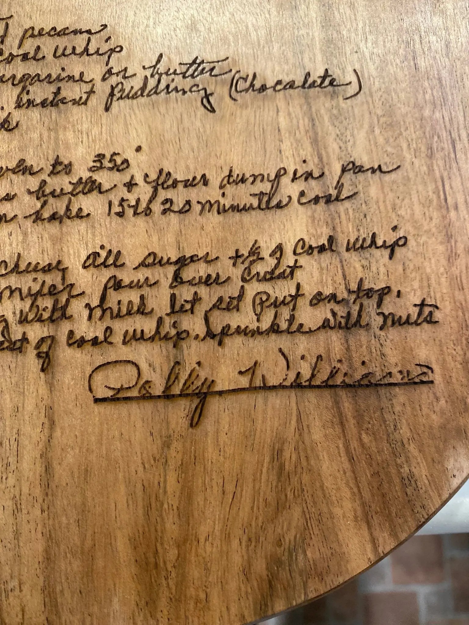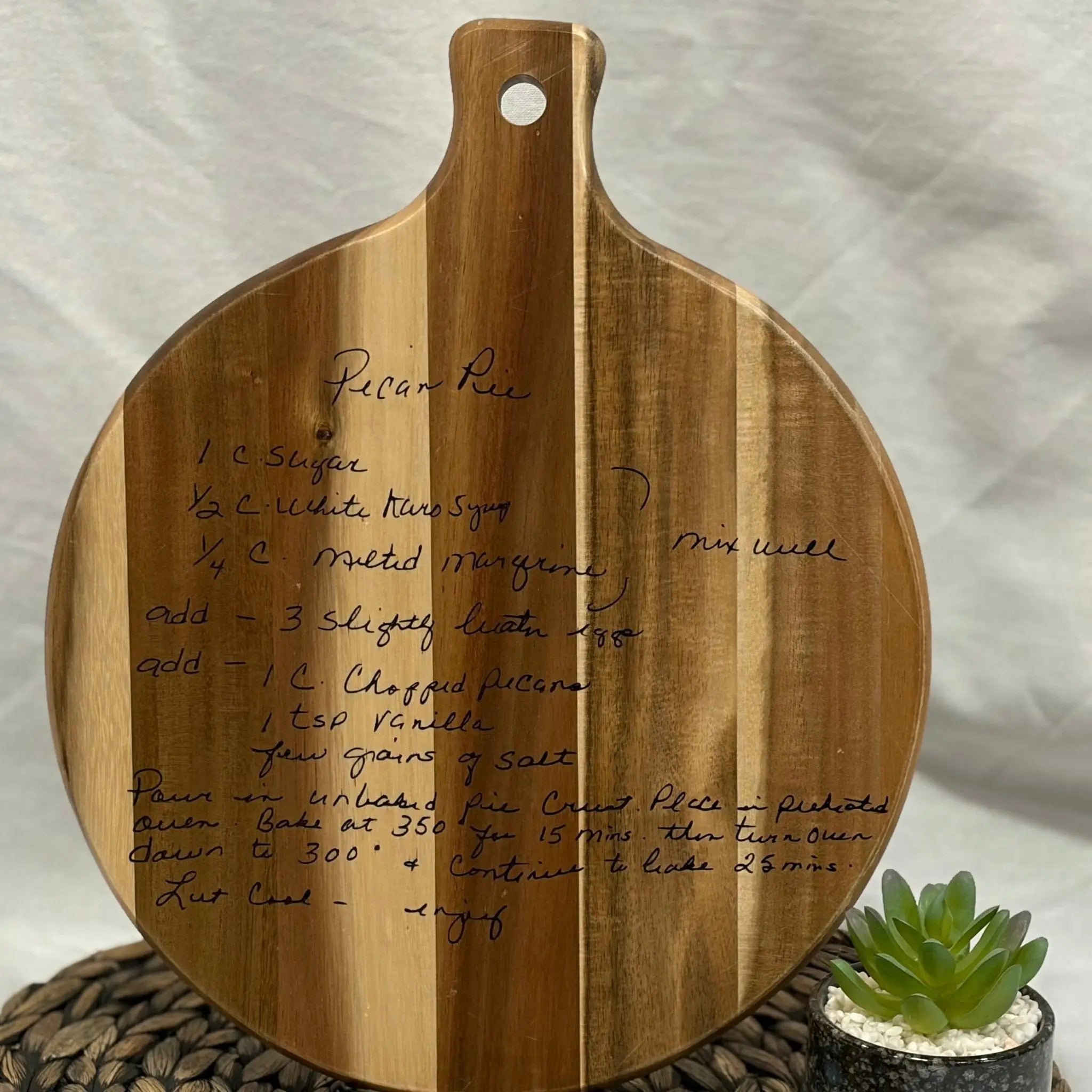 This engraved cutting board displays a handwritten recipe as a lasting keepsake. It is more than a kitchen utensil; it is a time capsule of flavors, connecting generations through shared culinary history. Available in small round, large round, and rectangular sizes, it can serve as kitchen décor or a memorial piece.