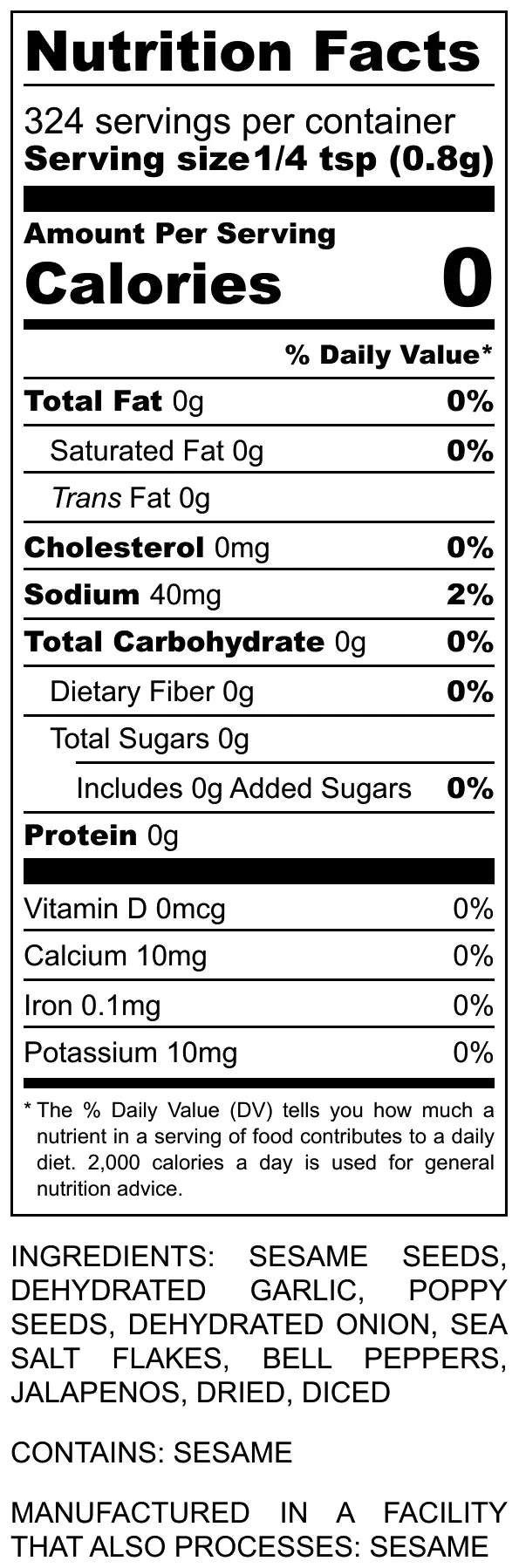 Everything Bagel just got an upgrade. Elevating the ordinary everything bagel, we've added our own distinctive flair. A dash of creativity led us to incorporate dehydrated red and green bell peppers, infusing a burst of flavor that commands attention. As if that weren't enough, we've elevated the experience further by introducing dehydrated jalapeños, adding not just flavor, but also a spirited kick that takes every bite to new heights. Note, the Jalapeños do not make it spicy but adds tons of flavor.
