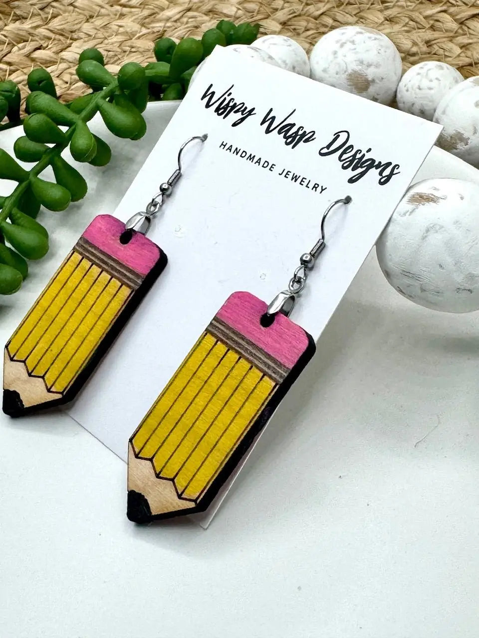 These pencil earrings are accessories shaped like pencils that hang from hypoallergenic hooks. The earrings are handmade in Mississippi, laser-cut from natural cherry wood, and meticulously hand-painted. They measure 3 inches in length and their boho style adds charm to any outfit.