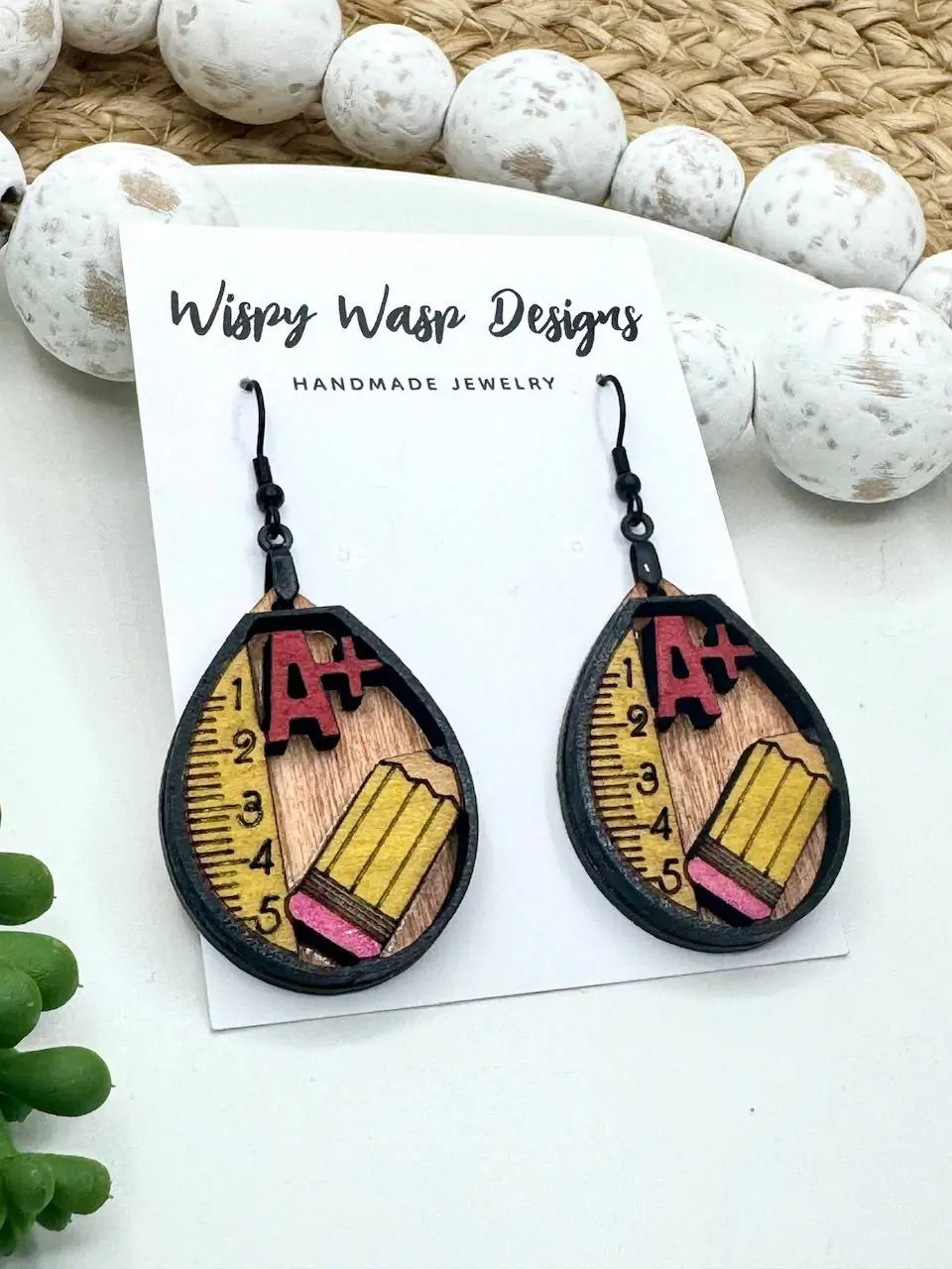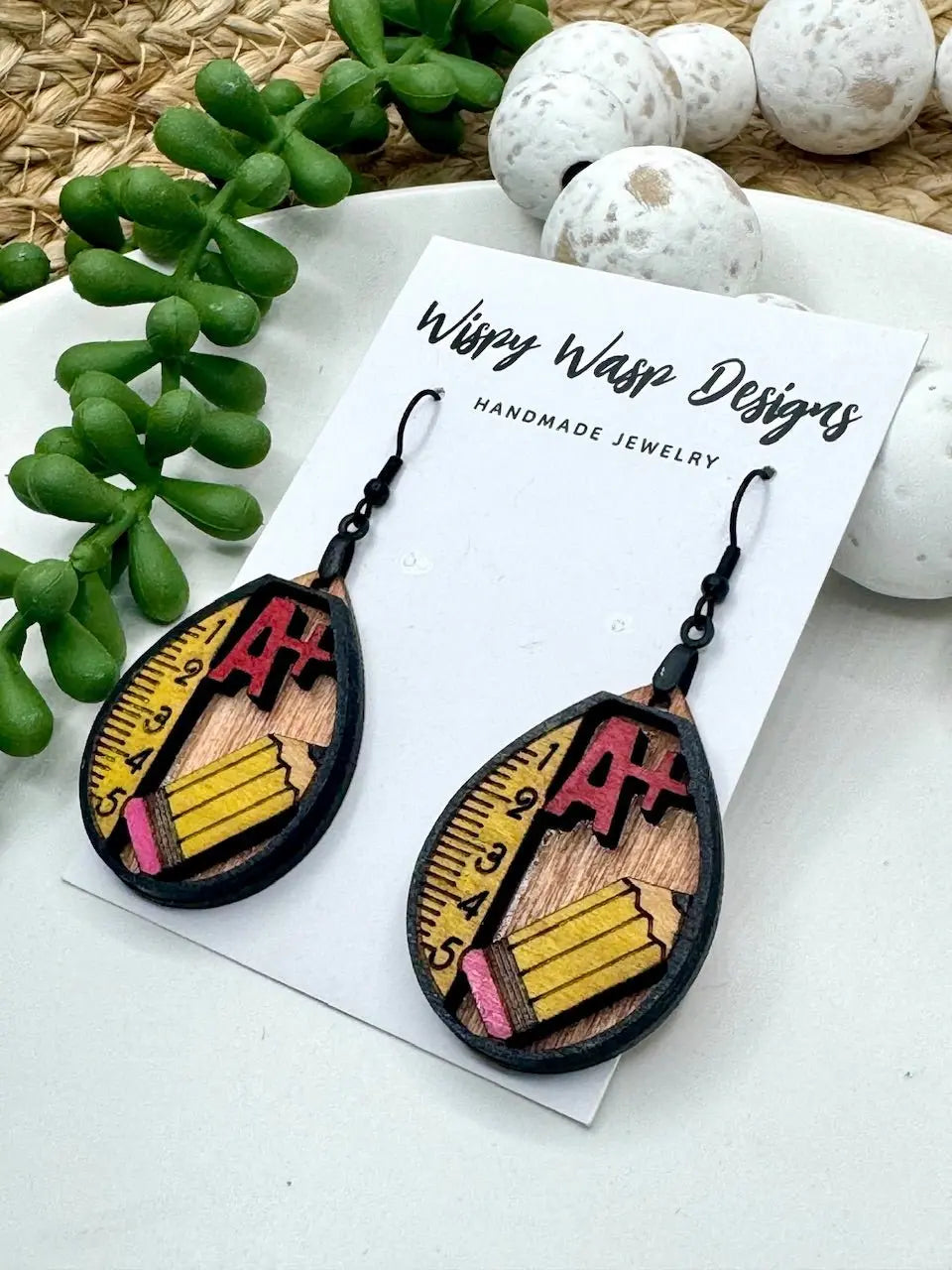 These school earrings designed for teachers are handmade in Mississippi by Wispy Wasp. Made from cherry wood, these school theme earrings have hypoallergenic stainless steel ear wires and are laser cut. They are carefully crafted and suitable for sensitive ears.