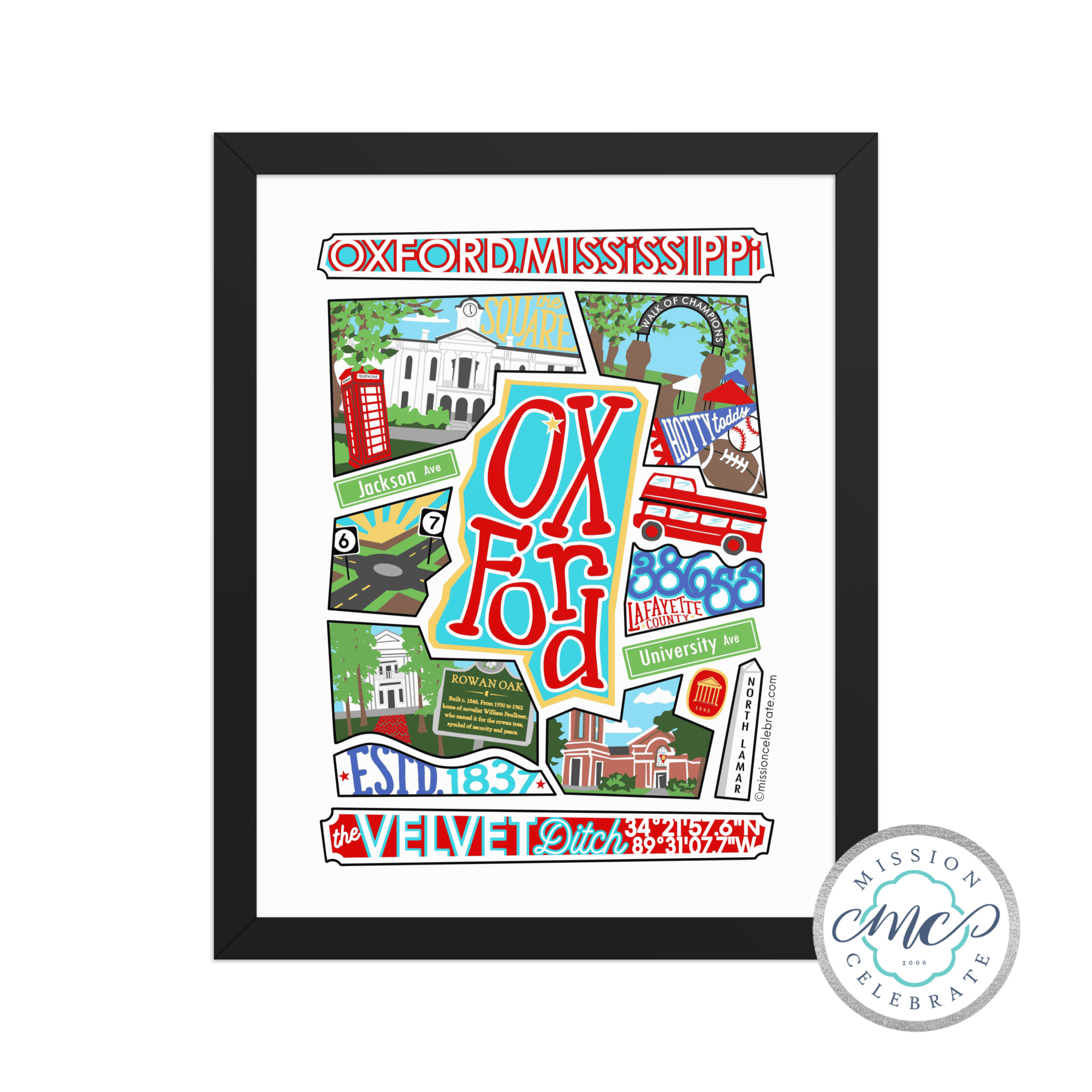 Oxford Mississippi Art Collage Framed Print by Main Street Collective: Velvet Ditch, Rowan Oak, Ole Miss Landmarks