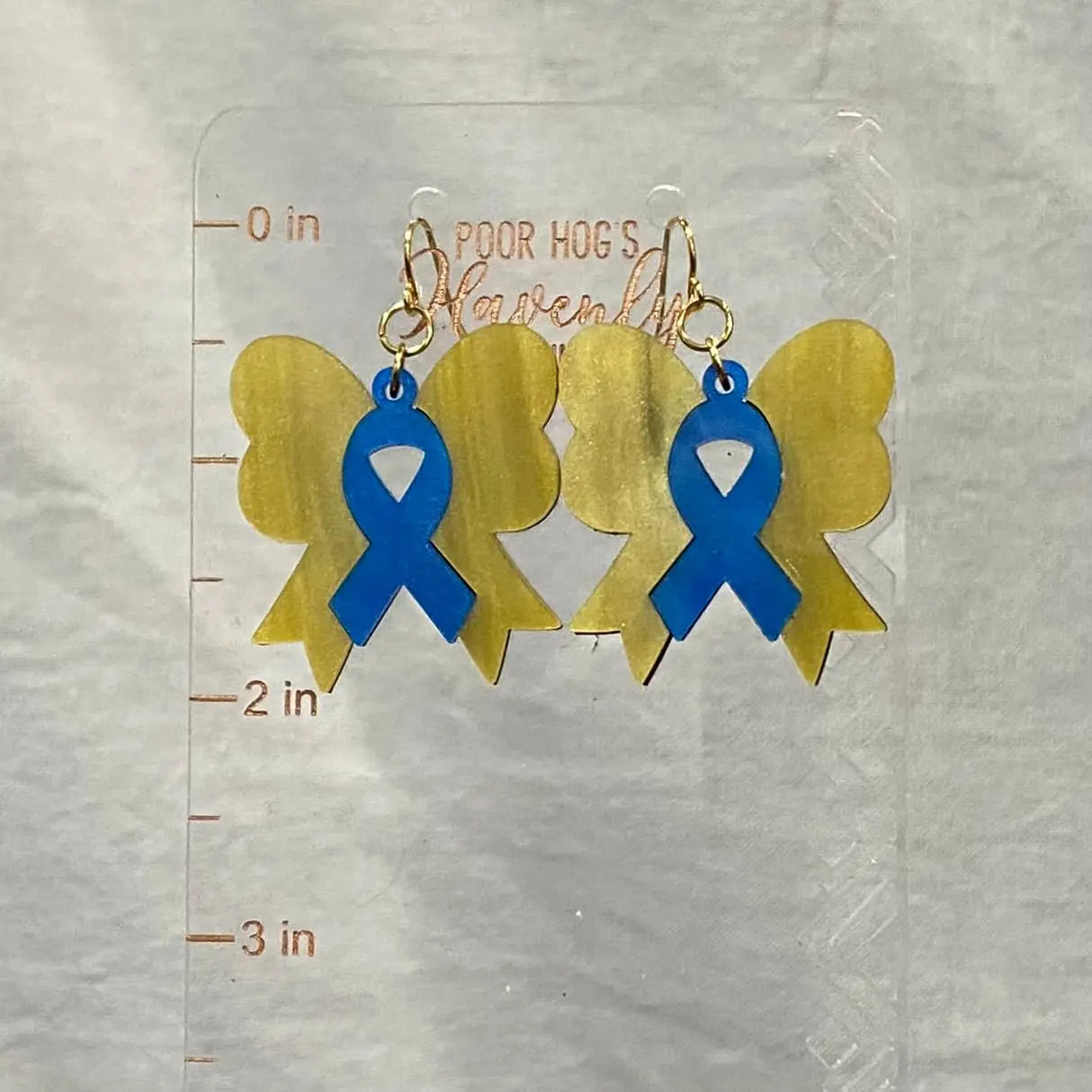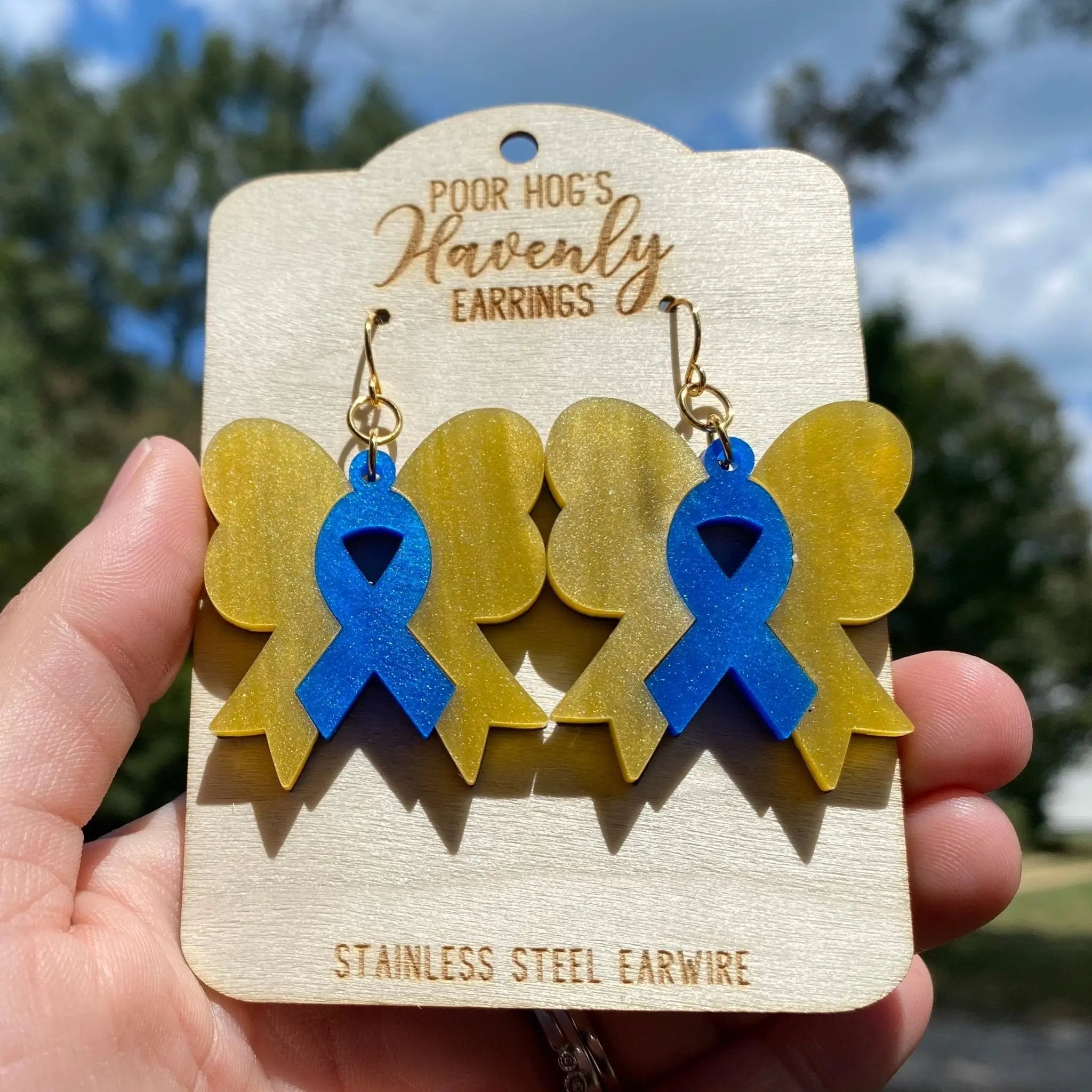 These Yellow and Blue Pearl Acrylic Ribbon Bow Dangle Earrings support Down Syndrome awareness. These earrings offer elegant shimmer and bold colors. The stainless steel earwires create lightweight, comfortable all-day wear. The handcrafted design made in Mississippi provides a unique, meaningful style.