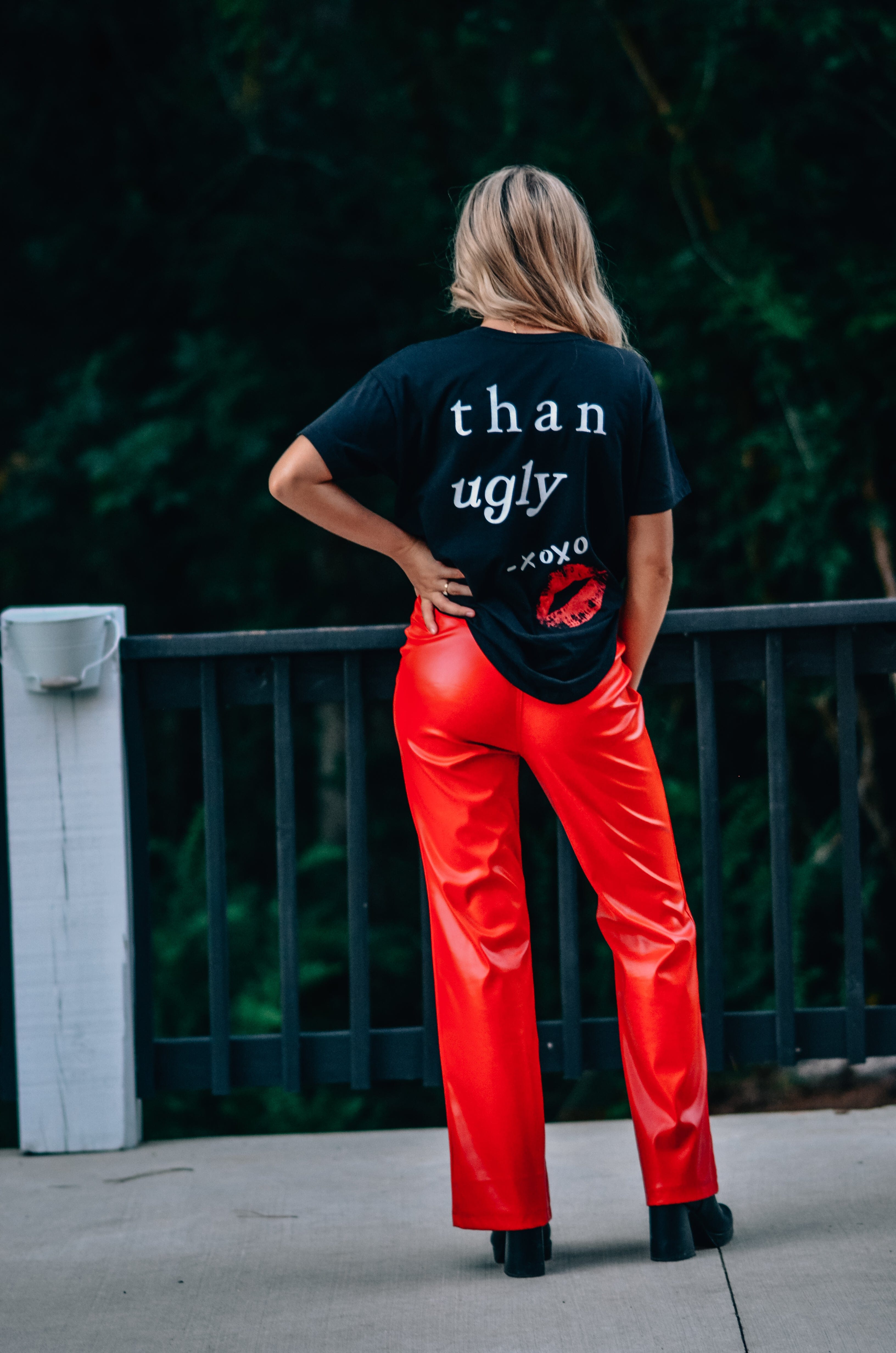 Those lips on the back POP! We are obsessed with this black tee style. Not cropped, she just has it tucked in front! Wear oversized or dress up for an OOTD style.