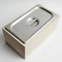 The stainless steel bin is Made in the USA by a restaurant supply company. The bin is an industrial grade product and may show signs of the production process.