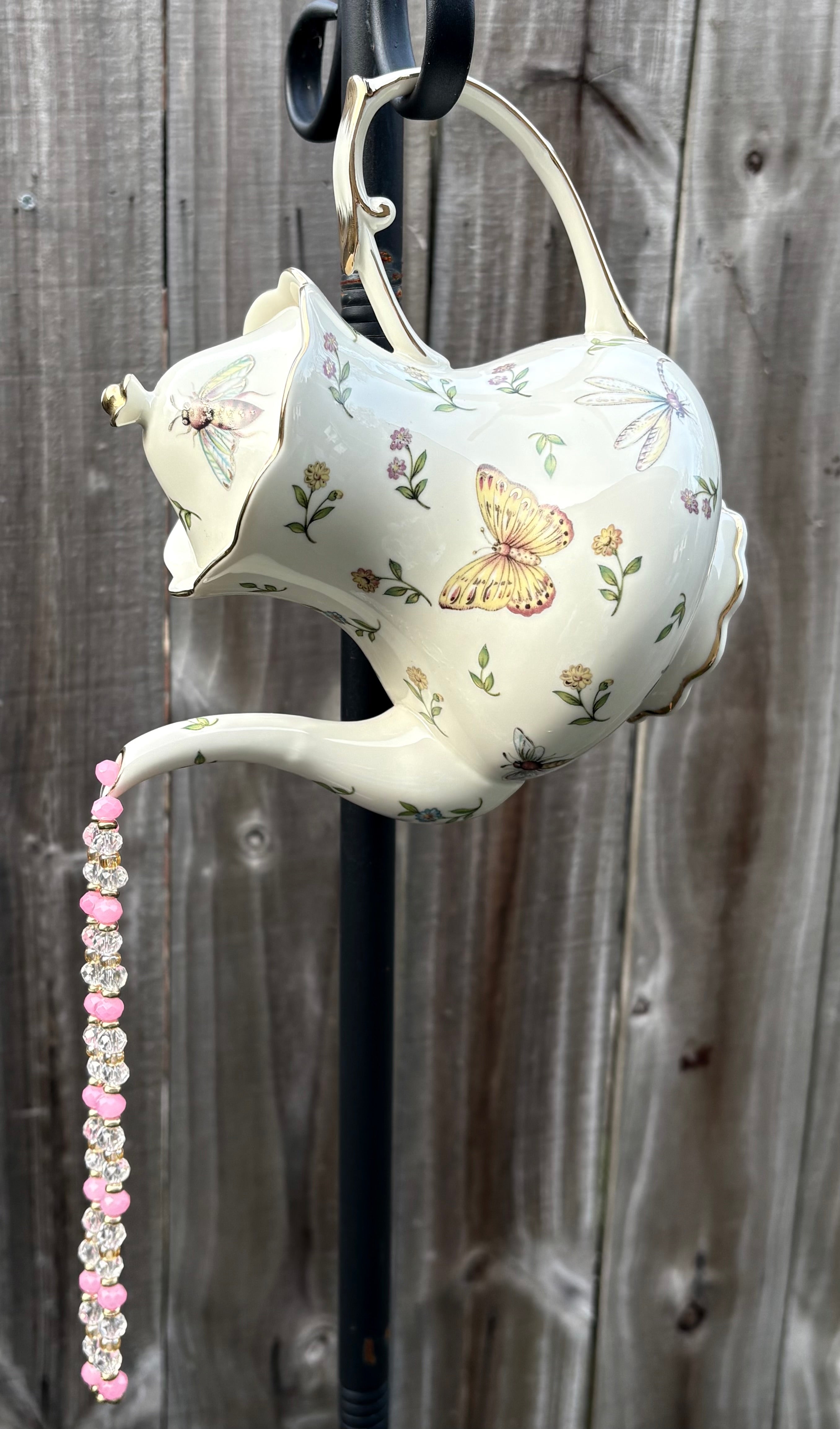 This is a decorative faux "pouring" teapot designed as an outdoor planter feature. The porcelain teapot is beautifully decorated with a soft, glossy finish in a cream color with delicate butterflies, dragonflies, and flowers. The spout features cascading strands of clear and pink crystal beads, creating the illusion of flowing water. A must have unique whimsical garden accent!