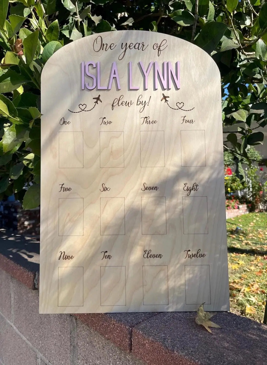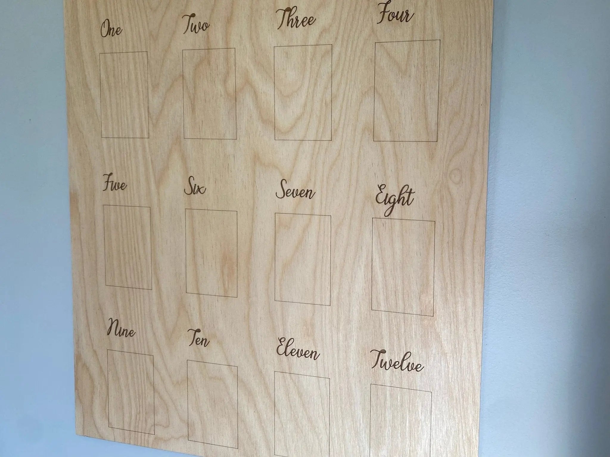 This milestone photo board allows parents to beautifully display their baby's monthly photos, creating a visual journey of their first year. This DIY board allows for easy personalization; simply add wallet-sized photos and customize it with your child's name and paint colors. The laser-engraved wooden board is coated in clear polyurethane, which creates a personalized charm for any nursery or home.