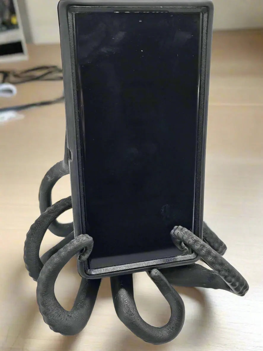 This octopus phone holder is a desk accessory made of 3D-printed material with eight flexible arms. The octopus design securely holds most smartphones in place for hands-free viewing. The phone holder keeps phones upright for easy viewing during video calls, study sessions, or work.