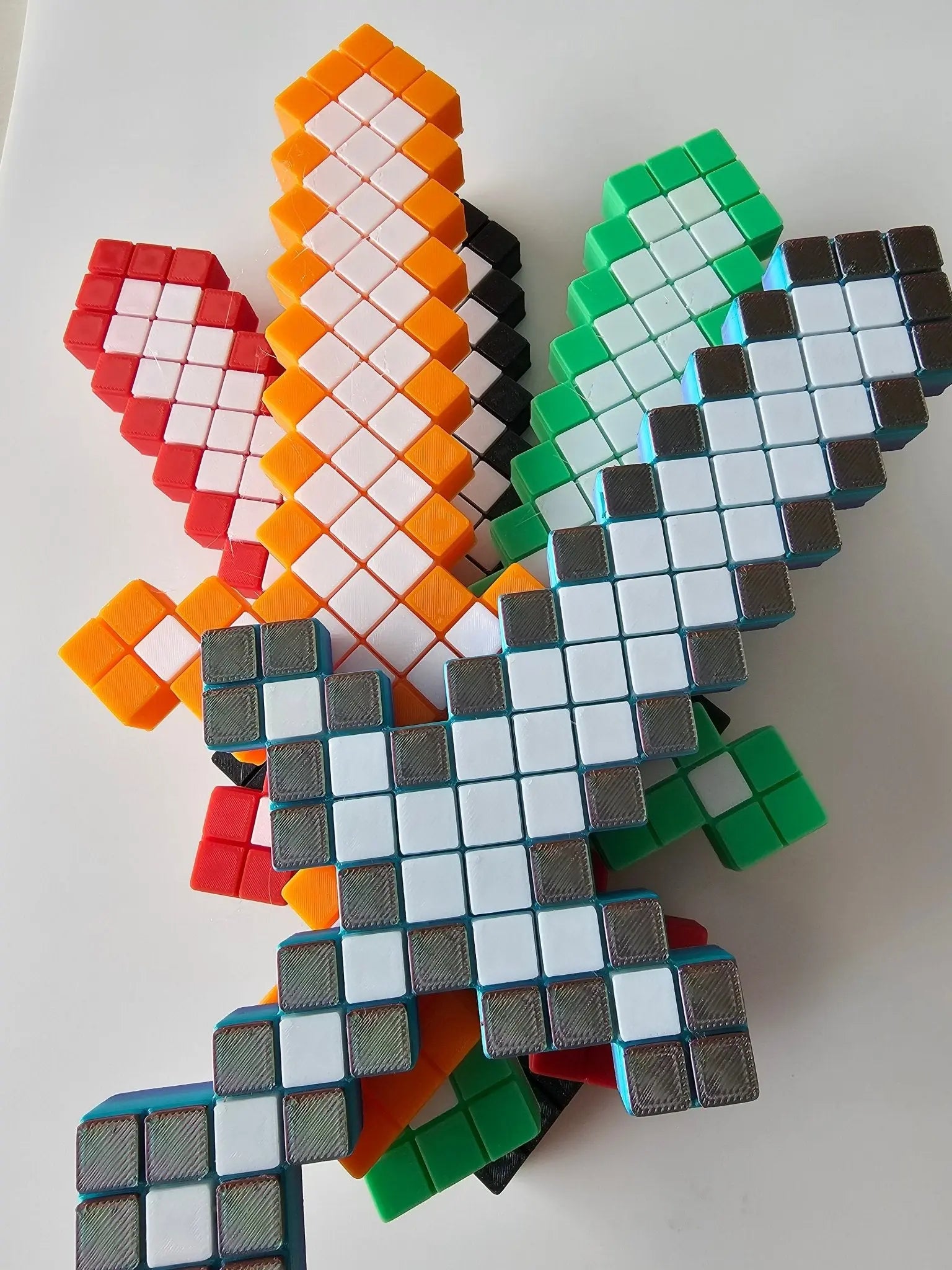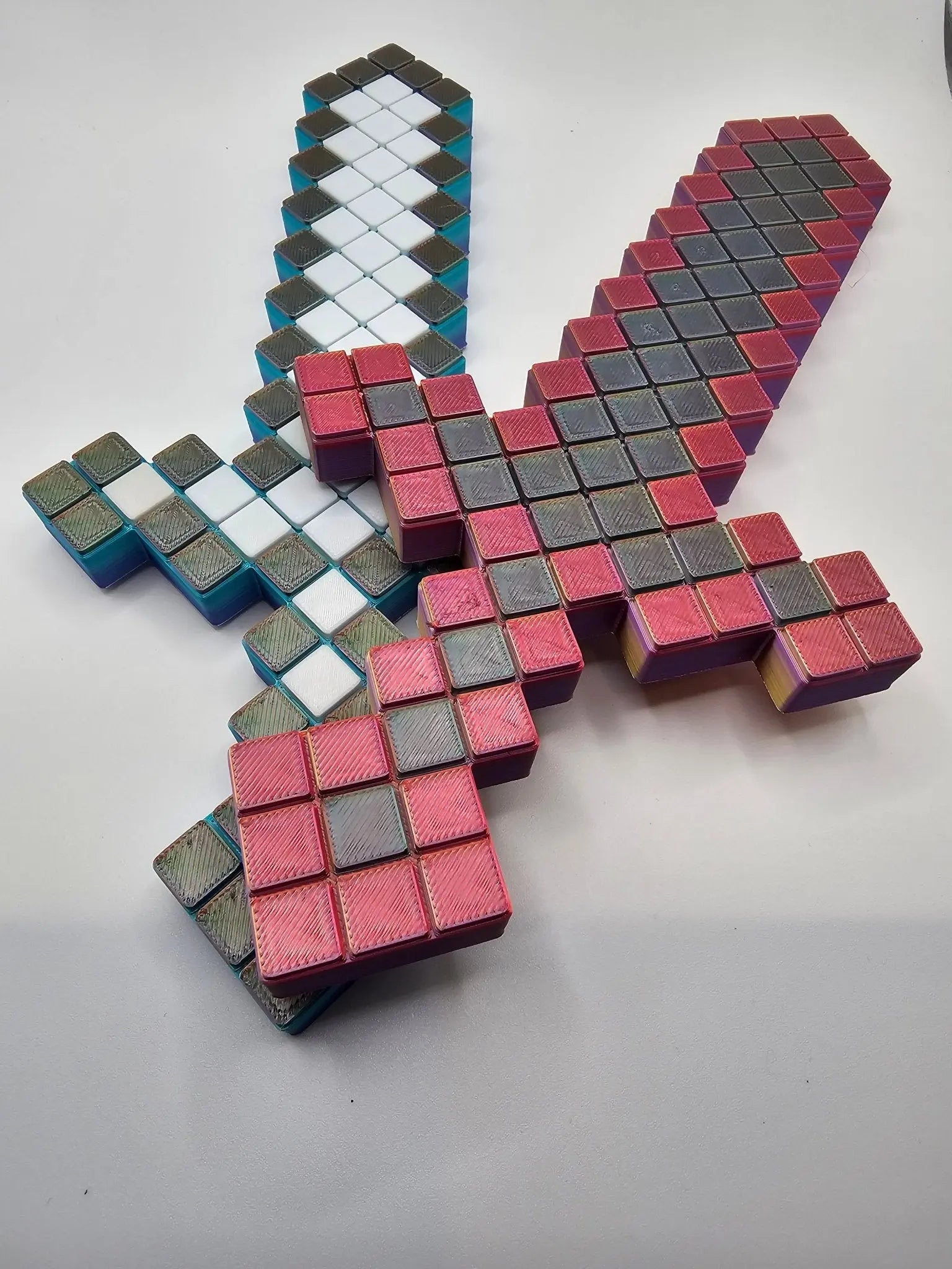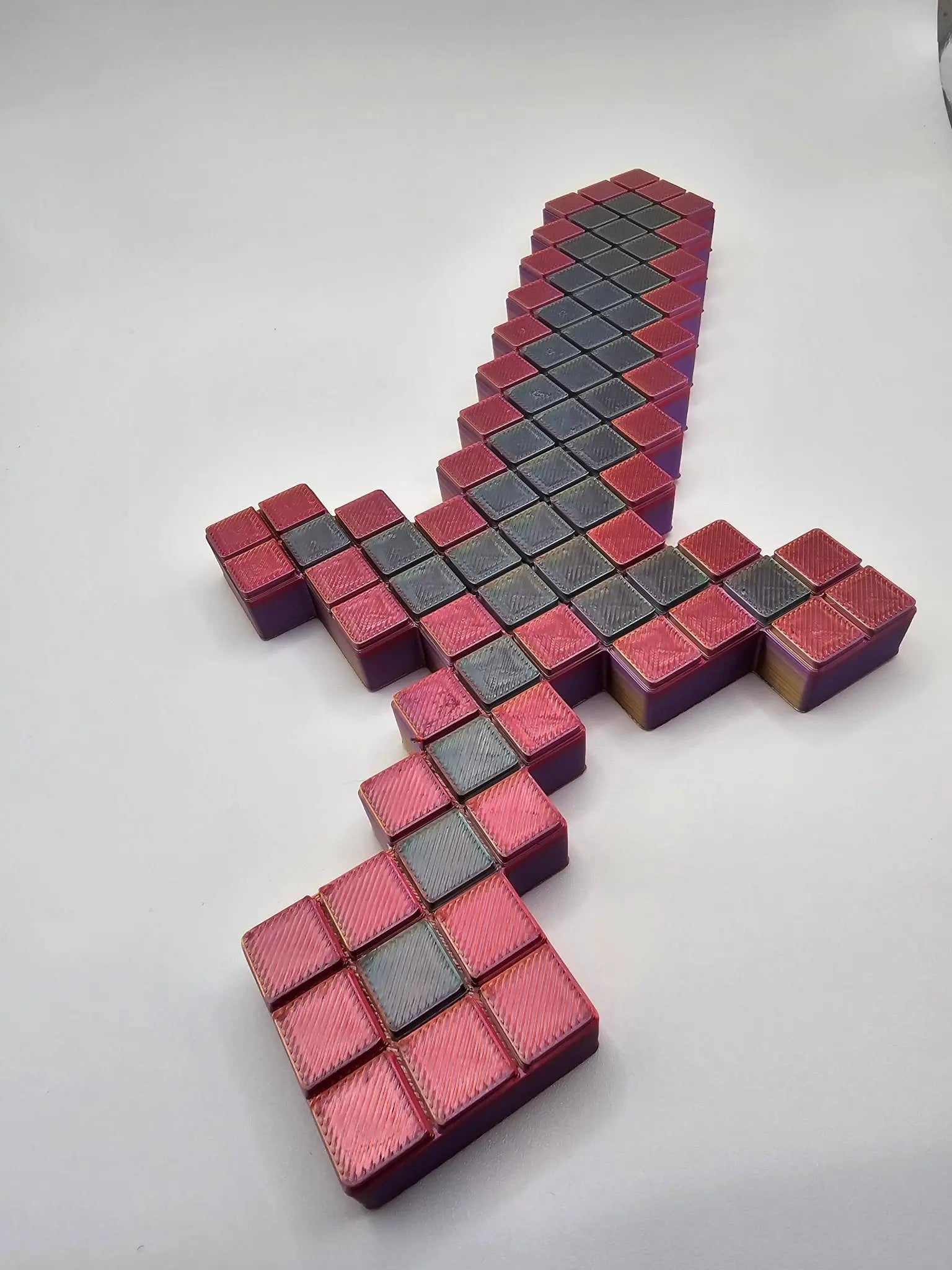 This Pixel Warrior Sword is a toy modeled after swords in block-style video games. It features a pixelated design with bright colors and measures approximately 10 inches in length. The sword can be used for cosplay or imaginative play and is durable enough for everyday use.